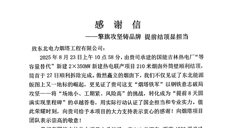 8月28日,烟塔公司收到业主国能吉林热电有限公司发来的感谢信,对烟塔公司承建的国能吉林热电厂“等容量替代”新建2*350MW热电联产项目210米烟囱外筒壁顺利结顶表示感谢和祝贺。烟囱结顶是一项重要的里...